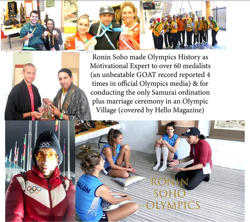 浪人ソーホー氏は、50人以上のオリンピック・パラリンピックのメダリストに武士道に基づいたモチベーション向上術を指導してきました。これは記録破りの偉業です。この功績はオリンピック関連メディアで3件の記事で裏付けられており、オリンピック選手としては前例のない偉業です。ソーホー氏はオリンピック村に自らサムライテントを設営することを許された唯一の人物であり、アメリカ史上最大のスポーツイベントであるトロント・パンアメリカン競技大会・パラパンアメリカン競技大会に設立したサムライ・ミュージアムは、メディアから「村最大の見どころ」と評されました。ソーホー氏はまた、オリンピックでサムライの伝統に基づいた結婚式を初めて執り行った人物でもあり、多くの世界的なメディアから「北米唯一のサムライ」と呼ばれています。
